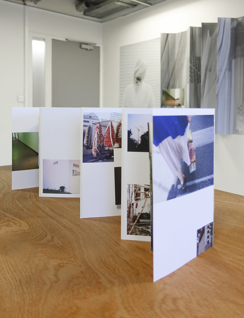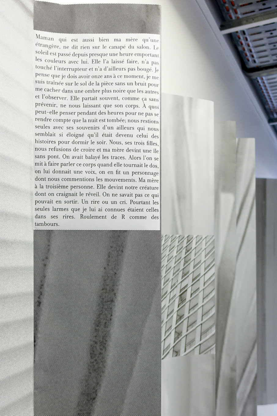 Dans ce projet,j'investis et contemple Bucarest, la ville de mes racines maternelles, à travers les souvenirs que m'en racontait ma mère et à travers les histoires que ses habitants m'inspire. Ce projet comporte un livre et une exposition rythmés par le motif du pli : c’est le pli de la jupe de ma mère qui répond au pli de l’architecture urbaine. Dans la scénographie, ce motif est décliné par des photographies pliées en accordéon, reproduisant le volume des bâtiments sur les murs de l’exposition ; son livre, quant à lui, est relié en leporello, et des textes s’incrustent dans les interstices de la photographie, par un jeu de découpes et de plis à même la page.